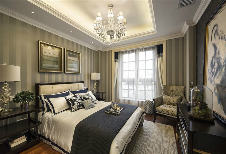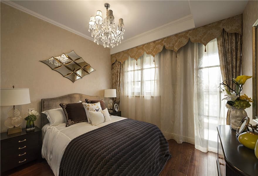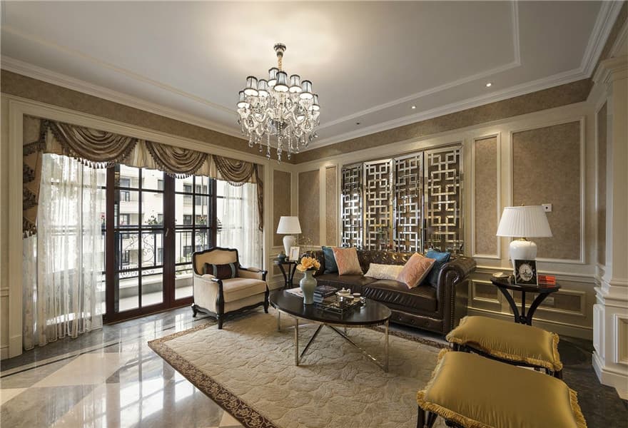 本案顶部做了圆形吊顶,让整体空间欧式元素有充分的体现,也采取了天圆地方的设计。