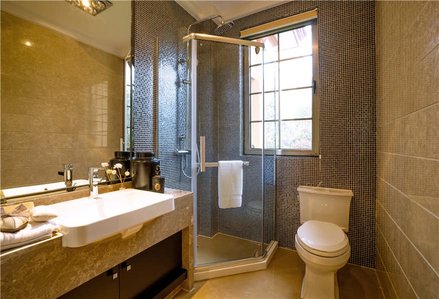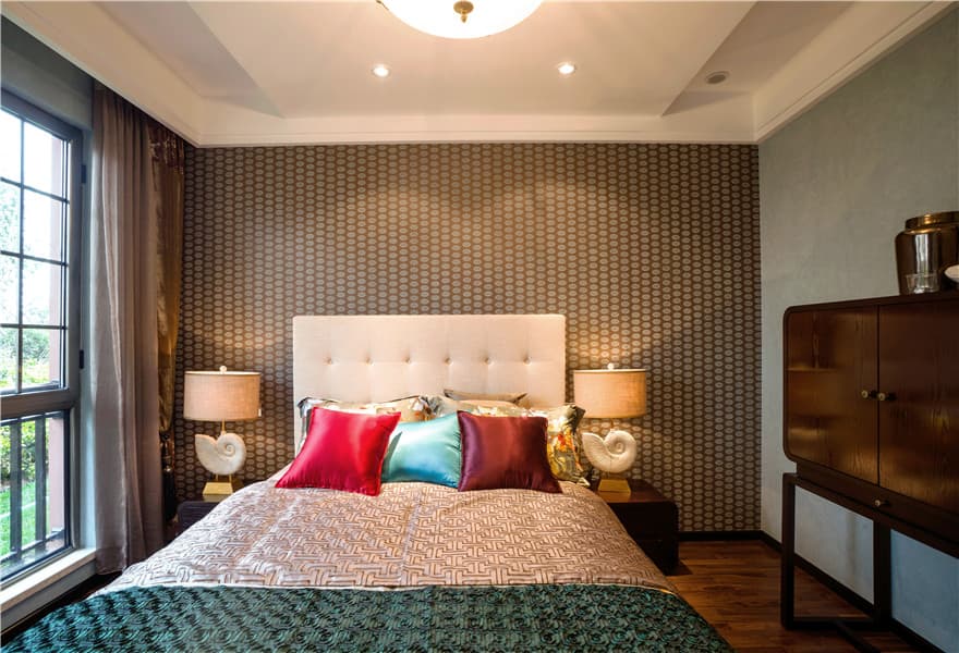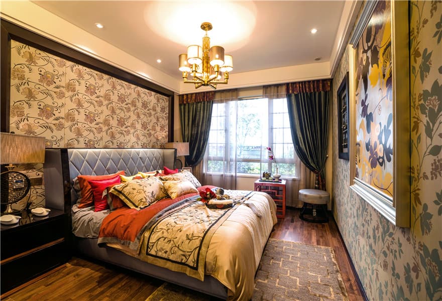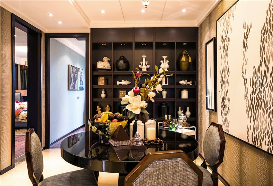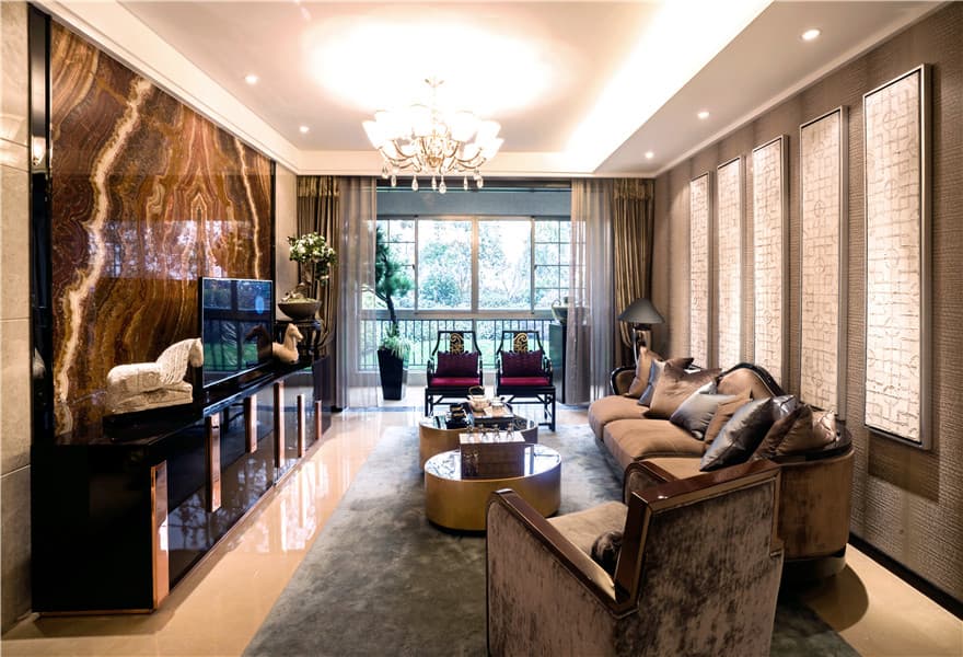 本案电视背景墙使用了中式花格做对称设计,玫瑰金材质,黑色钛钢收边。