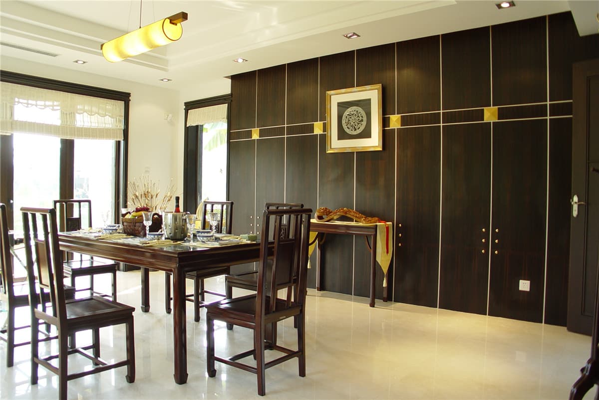 本案餐厅郑重的实木桌椅可同时容纳多人用餐,同样材质的储物柜和酒柜再为房间增添一丝古典气息。形似灯笼的吊灯憨态可掬,令人喜爱。